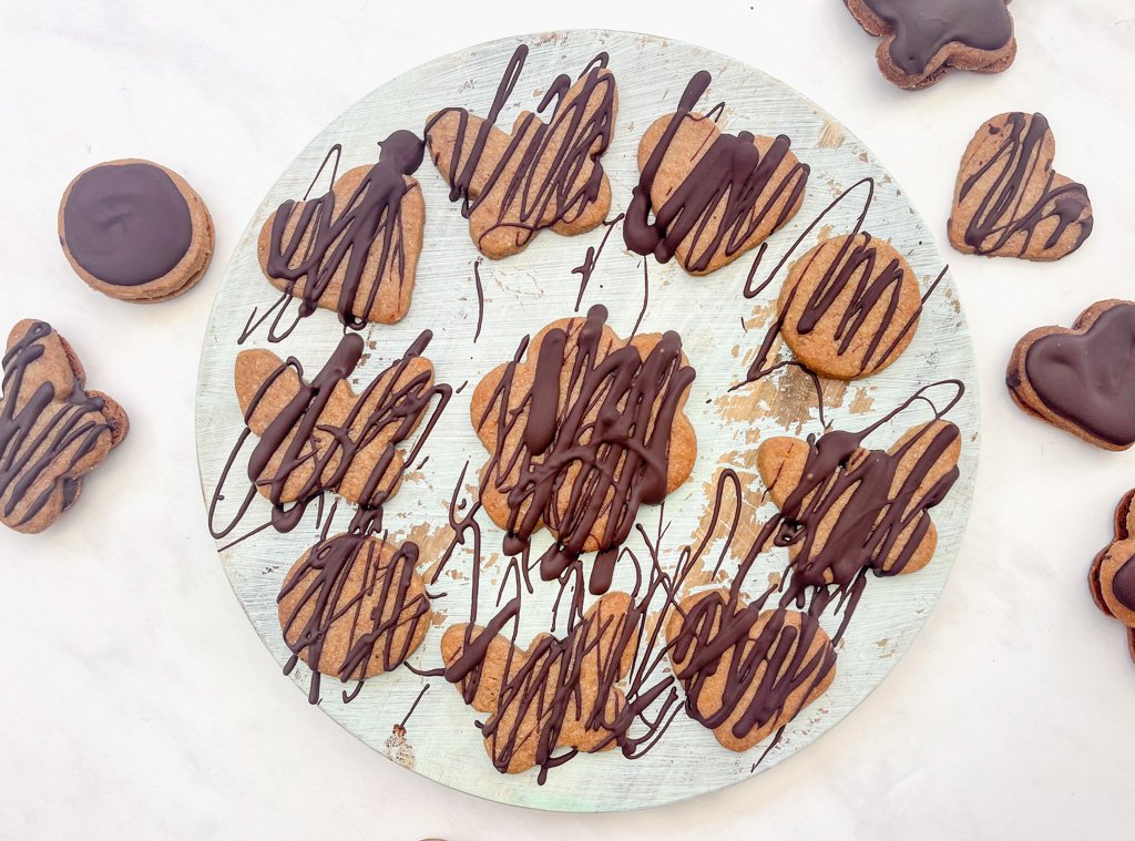 Tired of store-bought cookies with a laundry list of additives and preservatives that can be less than ideal, especially for our little ones? I hear you! That’s why I rolled up my sleeves to whip up these mouthwatering butter spelt cookies that are just as delicious, but skip the nasties. These cookies are made with wholemeal spelt flour, unsalted butter, and sweetened naturally with coconut sugar and maple syrup. To add that extra touch of decadence, I finish them off with a tempting drizzle of dark chocolate. I also love turning these into delightful biscuit sandwiches by spreading my homemade chia jam between two of these golden beauties.