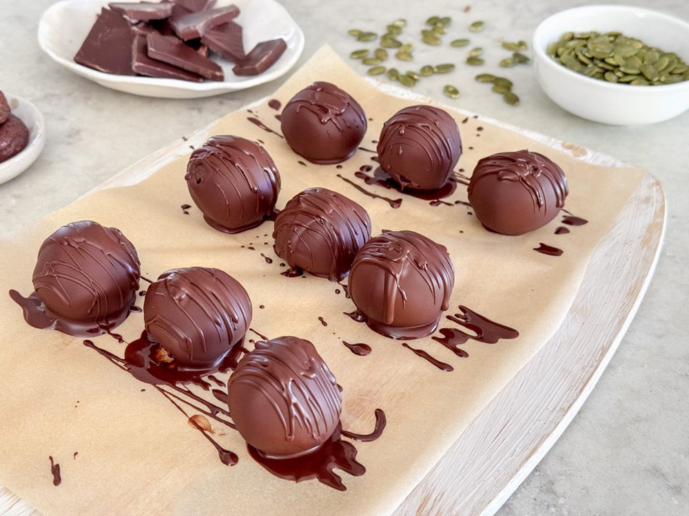 Dip each bliss ball into the melted dark chocolate or drizzle some chocolate on top. Allow any excess chocolate to drip off before placing them back on the tray.
