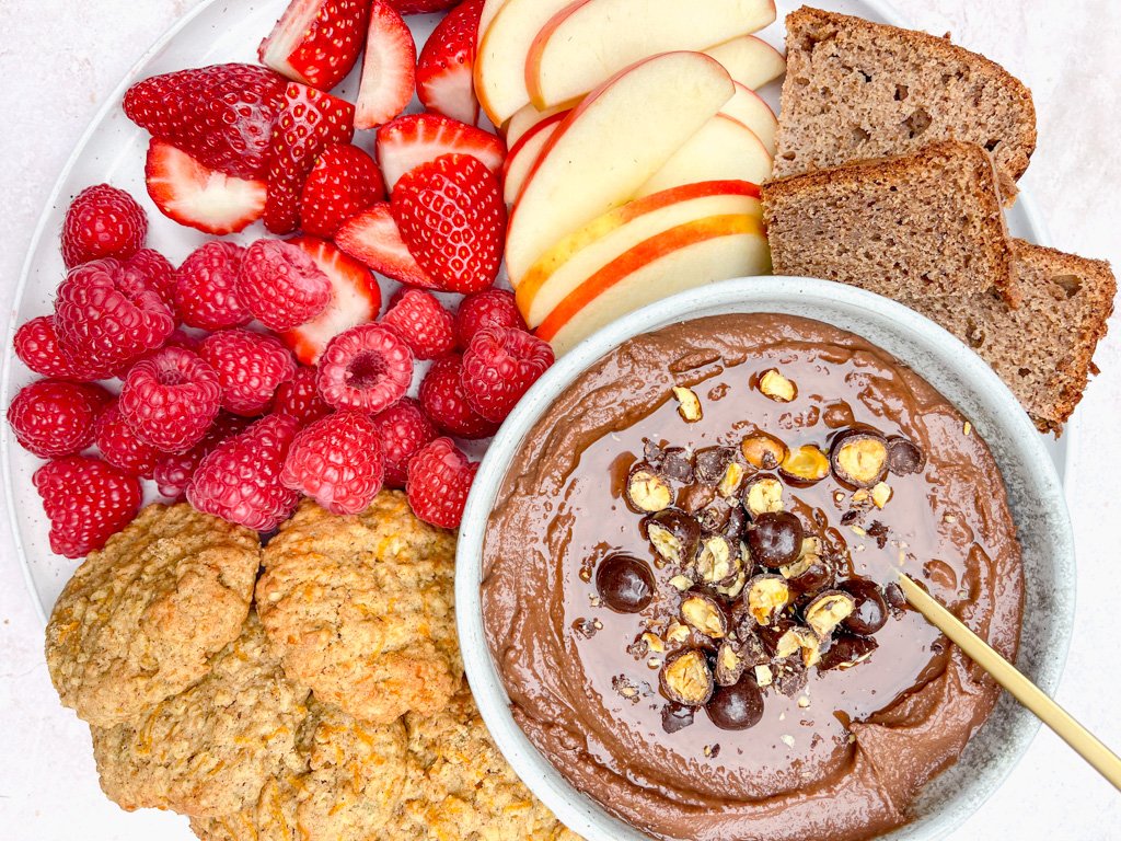 Chocolate chickpea hummus is a delicious and unique twist on the traditional hummus recipe. It combines the creamy goodness of chickpeas with the rich flavour of chocolate, creating a sweet dip that kids won’t be able to resist. And the best part is that making my simple Choc Chickpea Hummus Dip is quick and easy, requiring just a few simple ingredients and a food processor or blender. Enjoy it as a dip served with strawberries, bananas, apple slices, wholegrain crackers or my selection of healthy cookies. You can also use it as a frosting on muffins, spread on toast or as a filling for pinwheels or sandwiches.