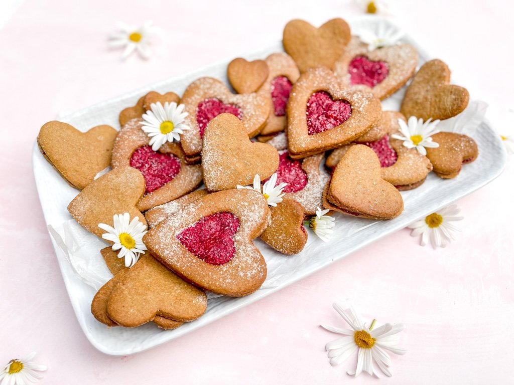 These beautiful Love heart biscuits are a healthier alternative to traditional biscuits, made with whole grain flours, healthy fats, and natural sweeteners. They’re high in fibre and protein, and can be enjoyed as a tasty and nutritious treat or snack. This recipe uses wholemeal spelt flour, unsalted butter, and coconut sugar for a sweet flavour. The Raspberry chia jam is rich in antioxidants, fibre, and omega-3 fatty acids, while being low in sugar. It’s a nutrient-dense and healthier alternative to traditional jams. Try making some at home today!