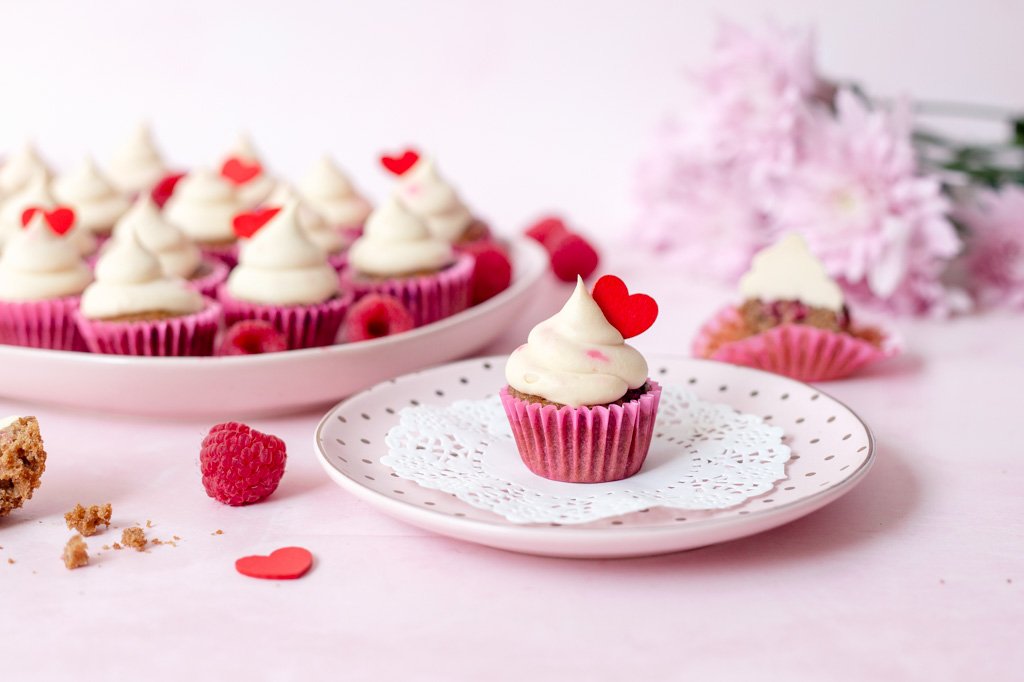 Once cupcakes have cooled completely, place frosting into a piping bag and pipe little swirls onto each cupcake. Decorate with raspberry halves, heart shaped toppers or rose petals.