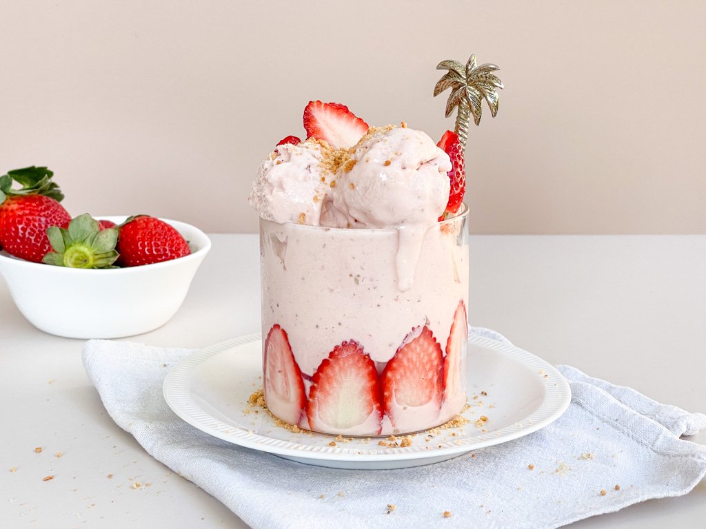 This recipe is a match to the viral cottage cheese ice cream – it offers a smoother texture with less blending required as well as a lower sodium content! You can use any fruit you like, fresh or frozen, and you can make it dairy-free by using coconut yoghurt!